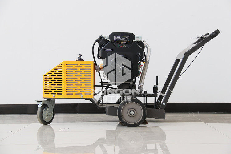 路面開槽機(jī)是由動(dòng)力強(qiáng)勁的發(fā)動(dòng)機(jī)作為動(dòng)力源,通過三角帶帶動(dòng)主軸高速旋轉(zhuǎn),手搖升降手輪使主軸下降,切割裂縫,前行走輪采用萬向輪,使整機(jī)在工作中可以按照裂縫自然形成的曲線進(jìn)行切槽,裝有匹配的風(fēng)扇頁還可以用做開槽后對(duì)槽里灰塵的清理,實(shí)現(xiàn)一機(jī)多用的目的。