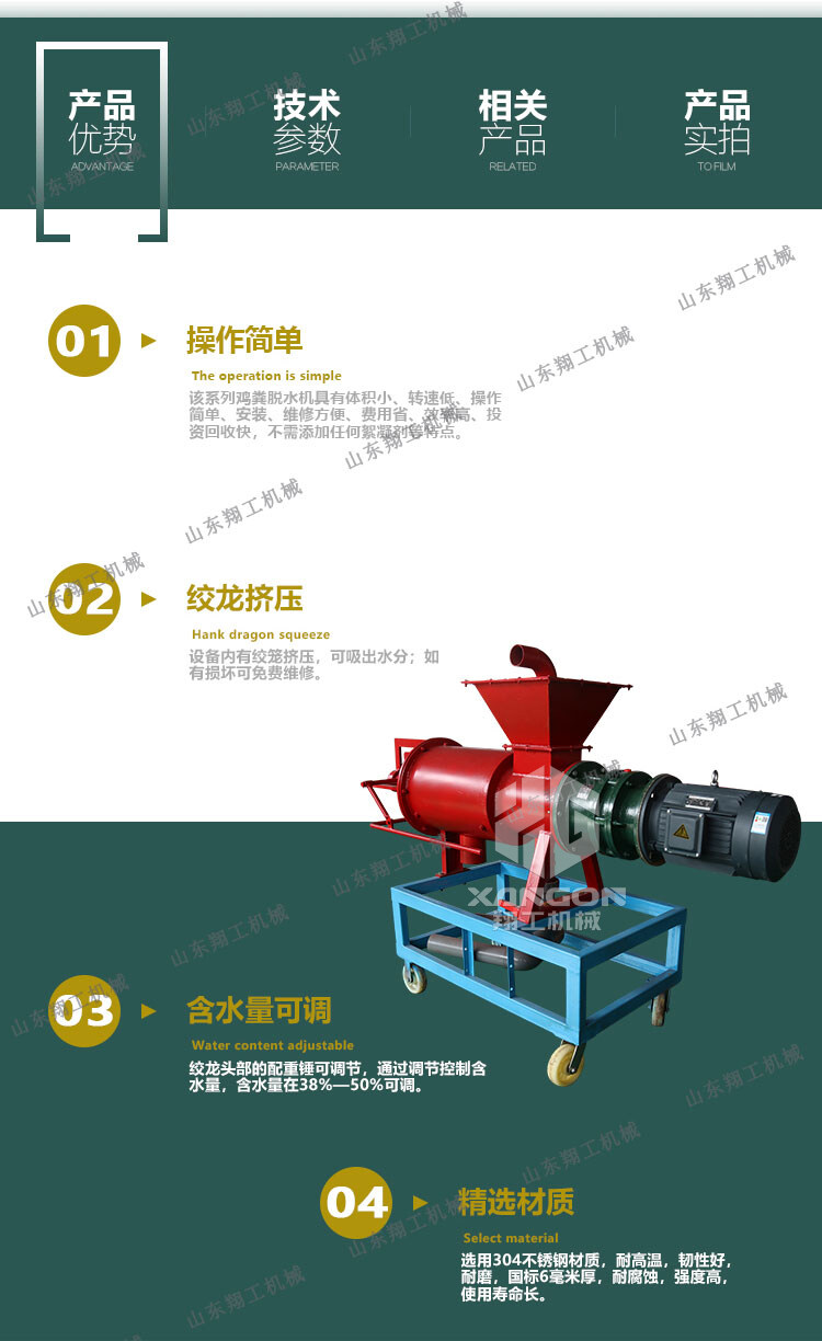 該系列雞糞脫水機具有體積小、轉速低、操作簡單、安裝、維修方便、費用省、效率高、投資回收快,不需添加任何絮凝劑等特點;該機采用的螺旋軸、篩網為不銹鋼制作;禽畜類糞便處理機能將雞糞、牛糞、豬糞等禽畜糞便原糞水分離為液態有機肥和固態有機肥;液態有機肥可直接用于農作物利用吸收;固態有機肥可運到缺肥地區使用,也可起到改觀土壤結構的作用,同時經過處理可制成有機復合肥。