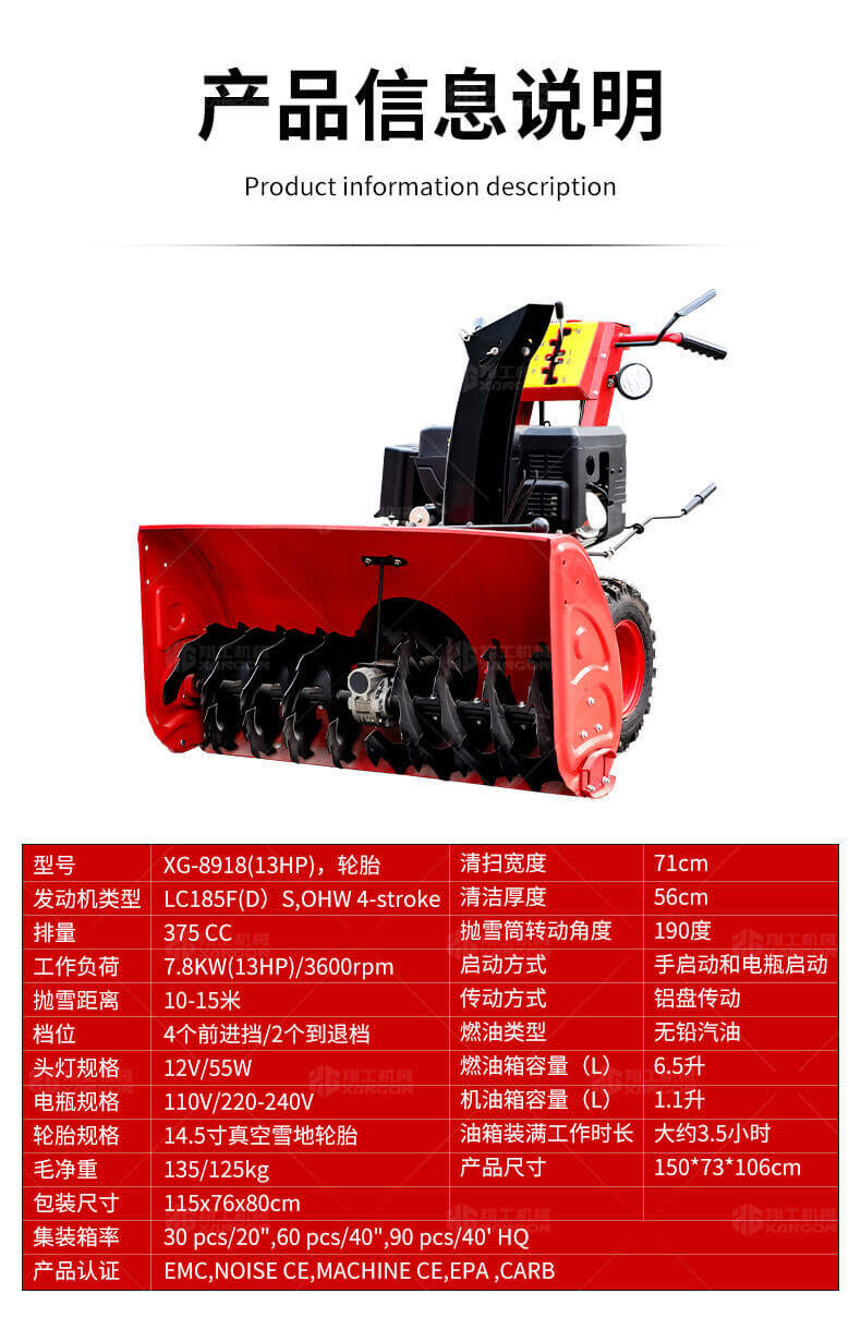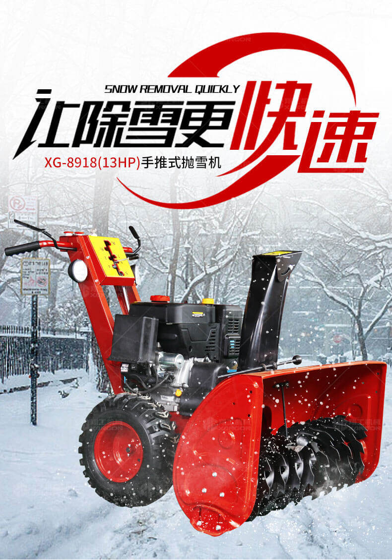XG-8918(13HP)手推式拋雪機是一款地面拋雪機,路面拋雪機,道路拋雪機。這款拋雪機采用LC185F(D)S,OHW 4-stroke發動機,強勁有力。葉片高速旋轉將雪旋進掃雪車里,再通過導管運到儲雪箱中。其特點是:采用大功率主機,寬幅、卓效,使用較廣。