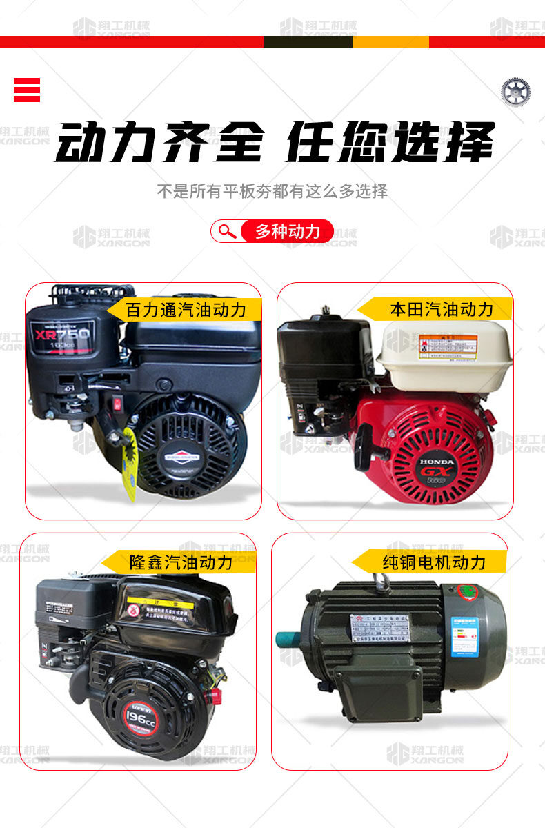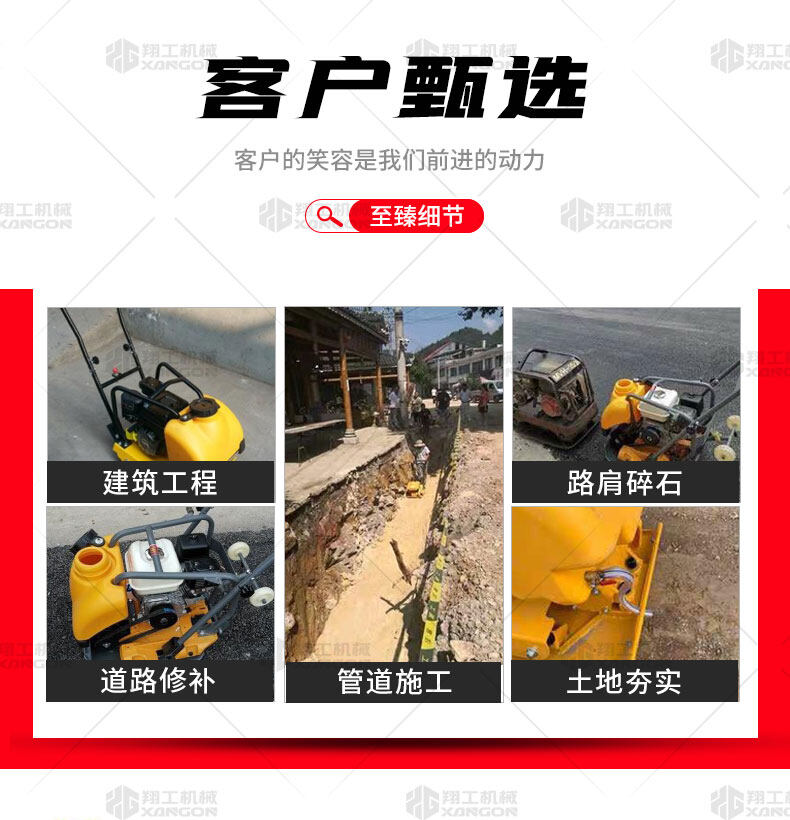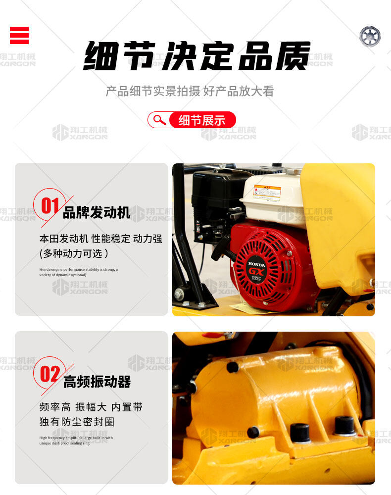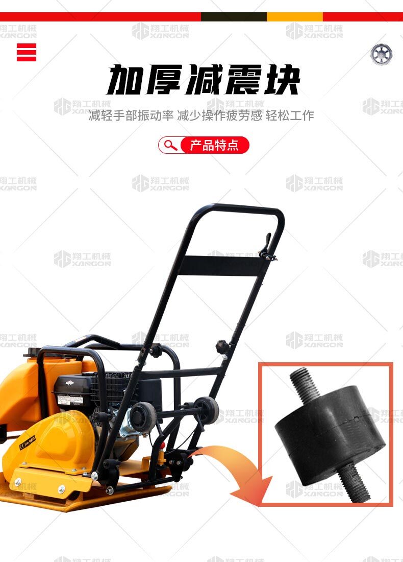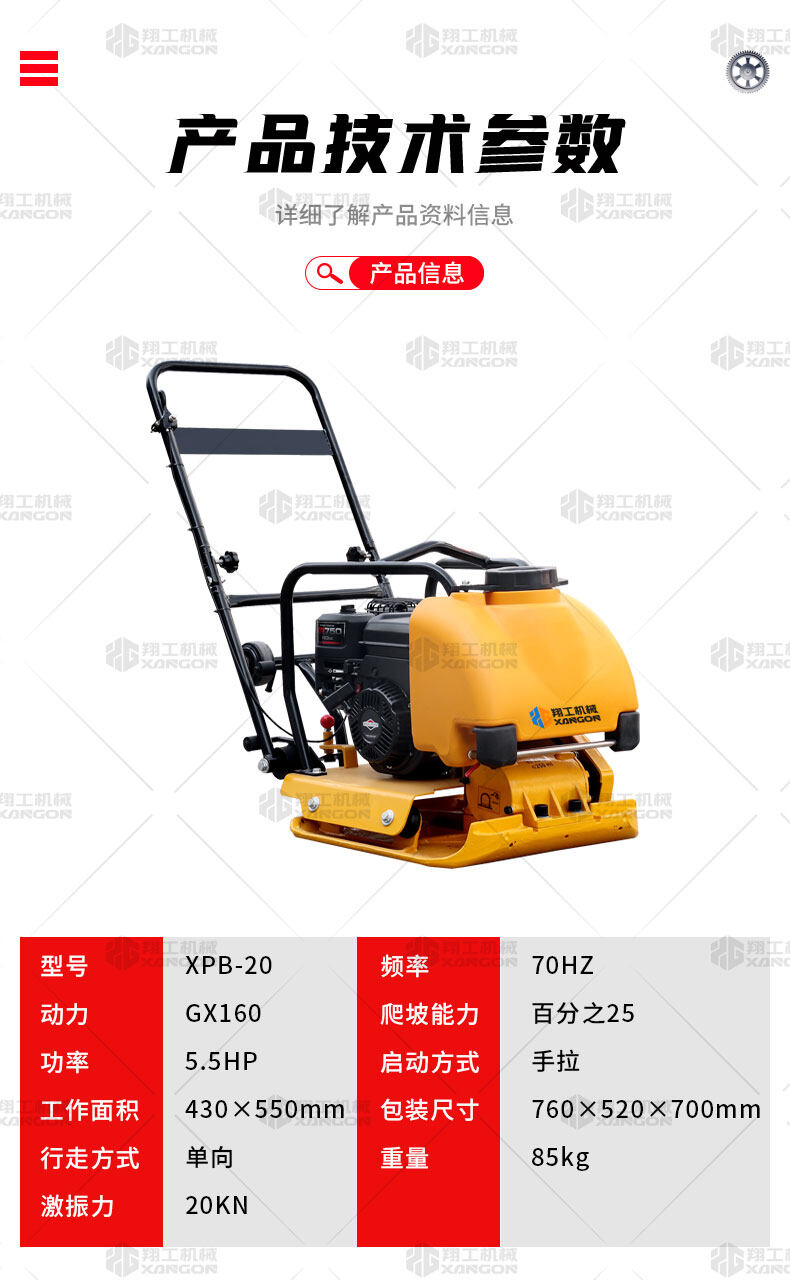 單向平板夯XPB-20適用于路基邊緣、橋涵、管道、溝槽底部等狹長地帶的壓實。 HONDA動力,性能優越,啟動容易 采用單獨懸掛式強力減震機構,減少對發動機的沖擊,提高操作人員的舒服感;