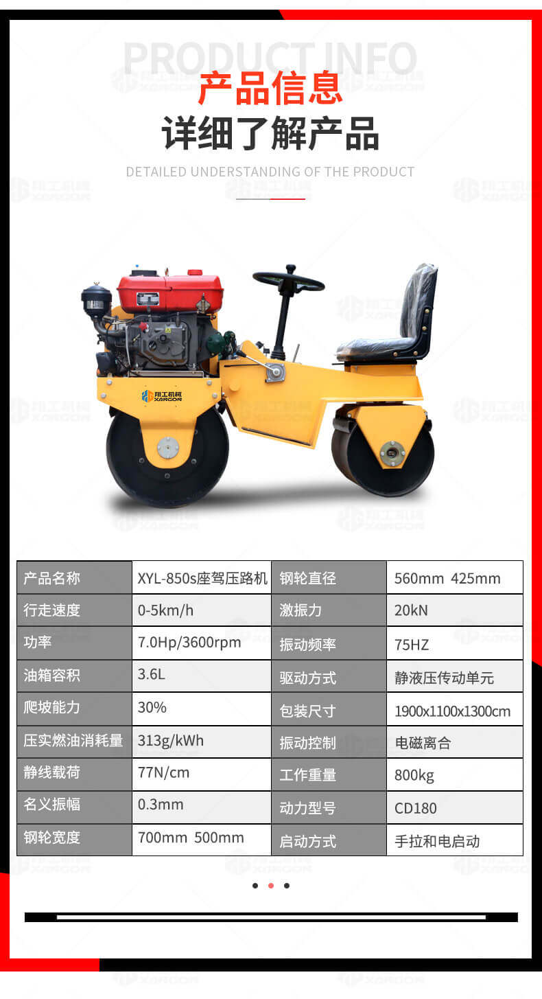 XYL-850S座駕壓路機用于壓實瀝青表面,壓實礫石、沙土等工程基礎,碾壓草坪,作業半徑小,可在狹小的區域內工作;國內名優柴油機,品質保證,性能優越,啟動容易;