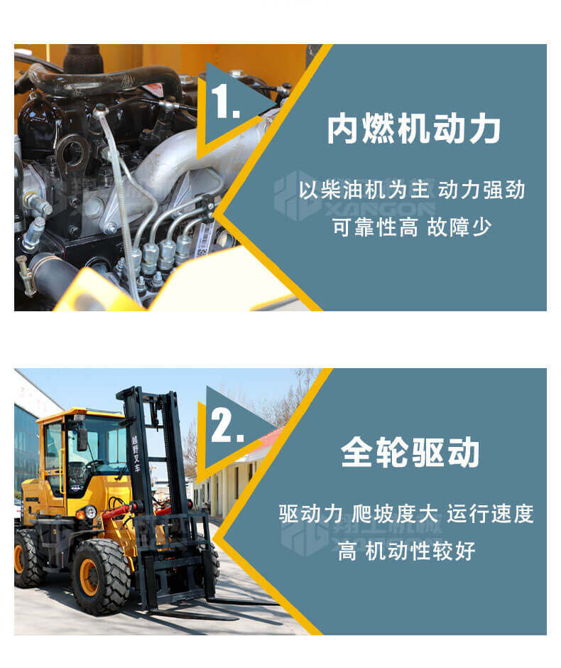 5.越野叉車發動機功率大,采用全輪驅動和越野輪胎。