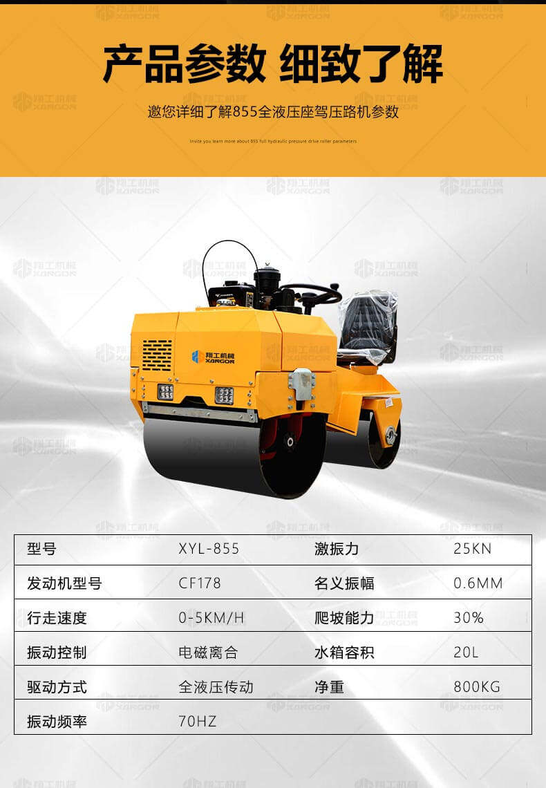 855座駕壓路機主要用于溝渠基礎,道路,體育場地的壓實整平,也可用于壓實瀝青表面的作業。