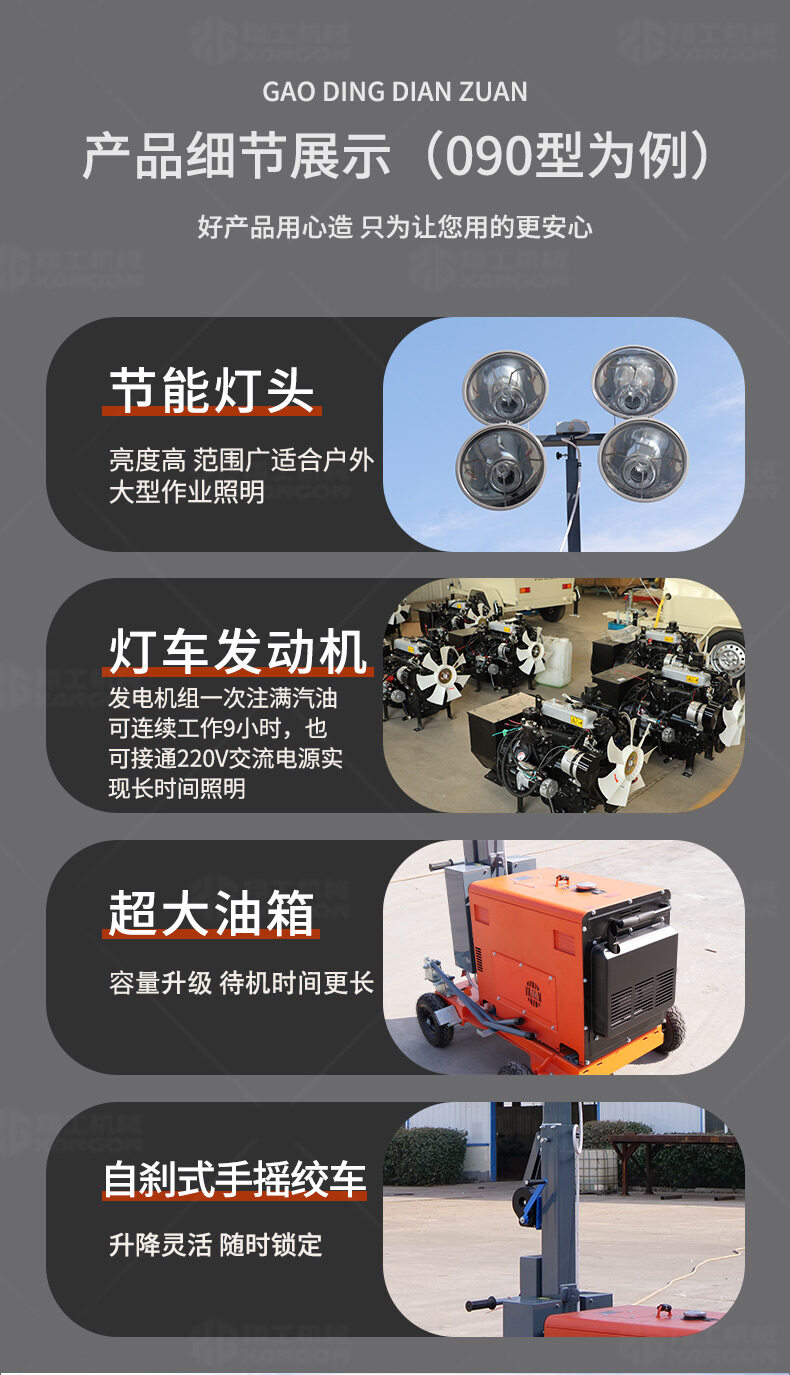 090型工程照明車用于體育場館、機場、碼頭等大型公共場所, 公路、鐵路、電力等緊急搶險現場,露天采礦現場, 以及防洪防汛、搶險救災現場等其它需要緊急備用光源、電源的場合