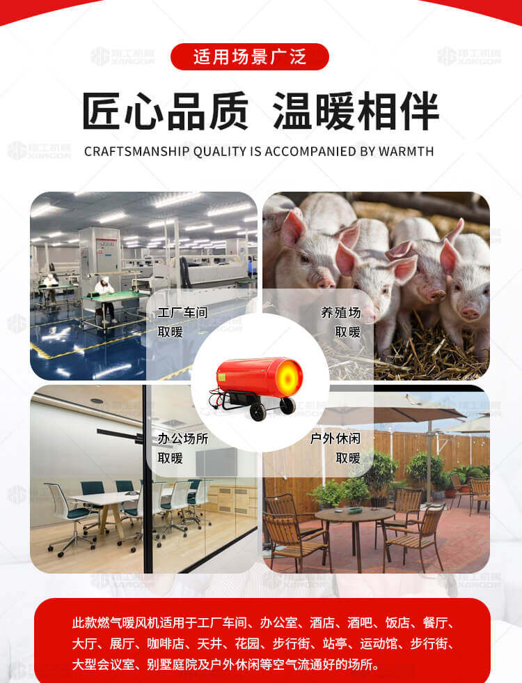 此款燃氣暖風機適用于工廠車間、辦公室、酒店、酒吧、飯店、餐廳、大廳、展廳、咖啡店.天井、花園、步行街、站亭、運動館、步行街、大型會議室、別墅庭院及戶外休閑等空氣流通好的場所。