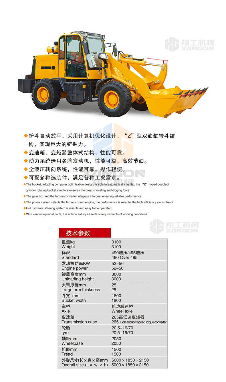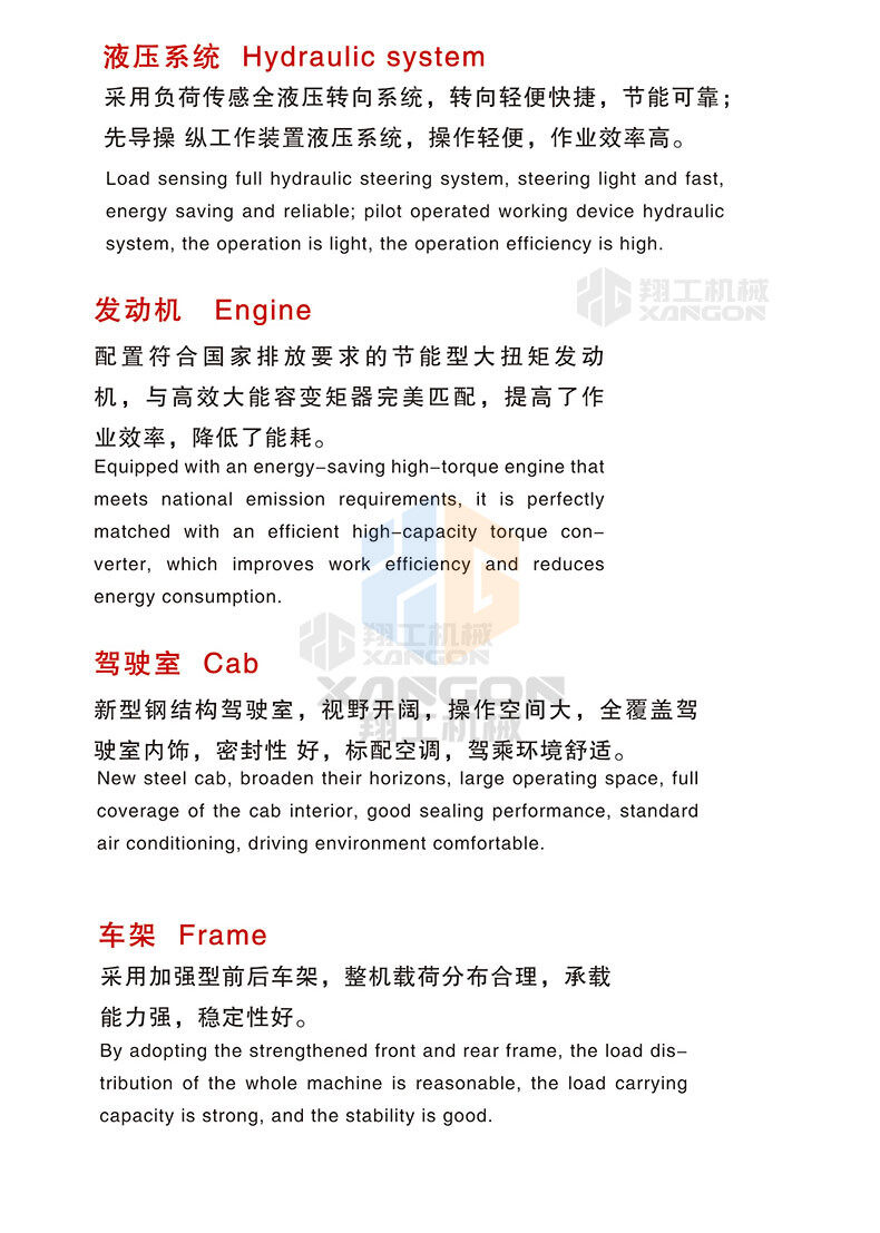 主要用于鏟裝土壤、砂石、石灰、煤炭等散狀物料,也可對礦石、硬土等作輕度鏟挖作業。換裝不同的輔助工作裝置還可進行推土、起重和其他物料如木材的裝卸作業。在道路、特別是在高等級公路施工中,裝載機用于路基工程的填挖、瀝青混合料和水泥混凝土料場的集料與裝料等作業。