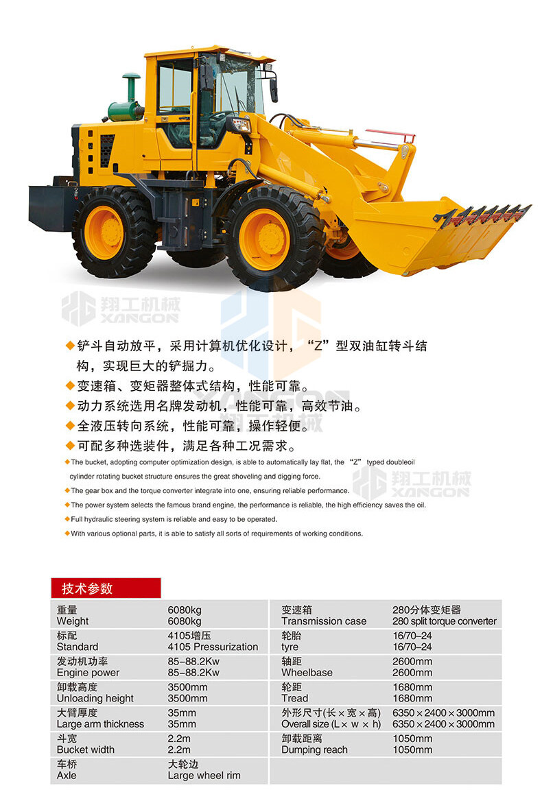 主要用于鏟裝土壤、砂石、石灰、煤炭等散狀物料,也可對礦石、硬土等作輕度鏟挖作業。換裝不同的輔助工作裝置還可進行推土、起重和其他物料如木材的裝卸作業。在道路、特別是在高等級公路施工中,裝載機用于路基工程的填挖、瀝青混合料和水泥混凝土料場的集料與裝料等作業。