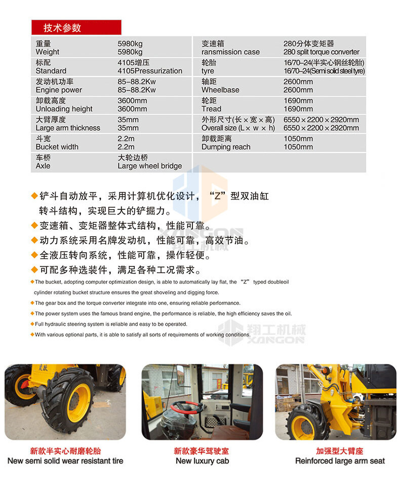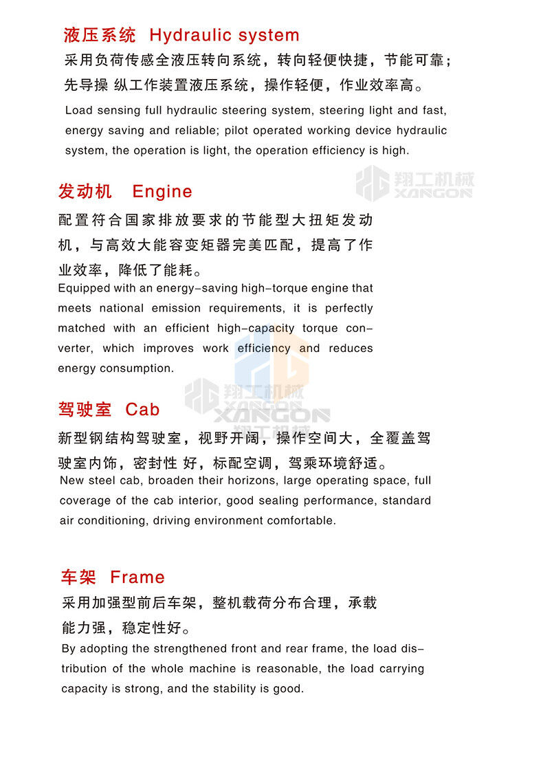 主要用于鏟裝土壤、砂石、石灰、煤炭等散狀物料,也可對礦石、硬土等作輕度鏟挖作業(yè)。換裝不同的輔助工作裝置還可進行推土、起重和其他物料如木材的裝卸作業(yè)。在道路、特別是在高等級公路施工中,裝載機用于路基工程的填挖、瀝青混合料和水泥混凝土料場的集料與裝料等作業(yè)。